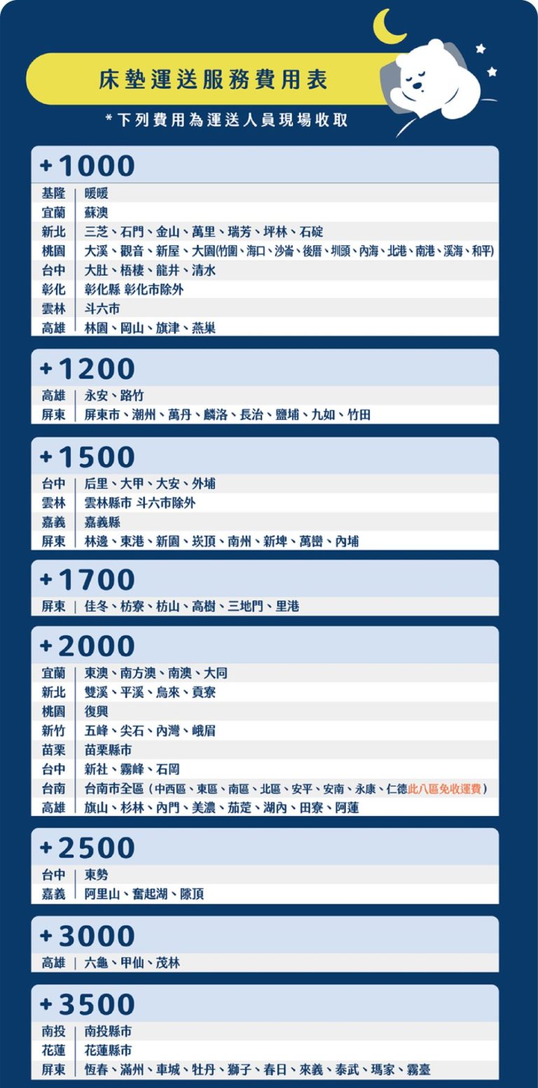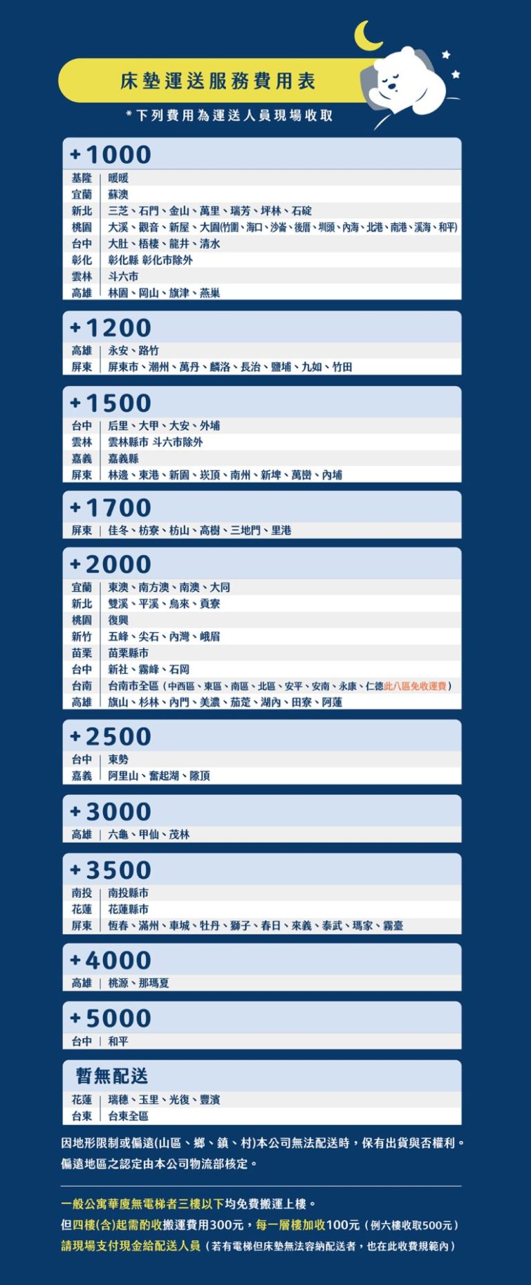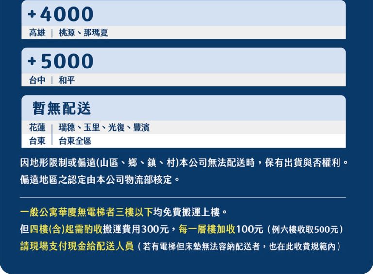 配送範圍請參考上方床墊運送與偏遠地區費用表,若收件地區為特殊偏遠地區限制無法配送時,本公司保留接單出貨與否的權利 。外島恕無法接單配送。收件地若需使用吊車或非一般標準搬運方式,需請訂購人自行處理相關費用。